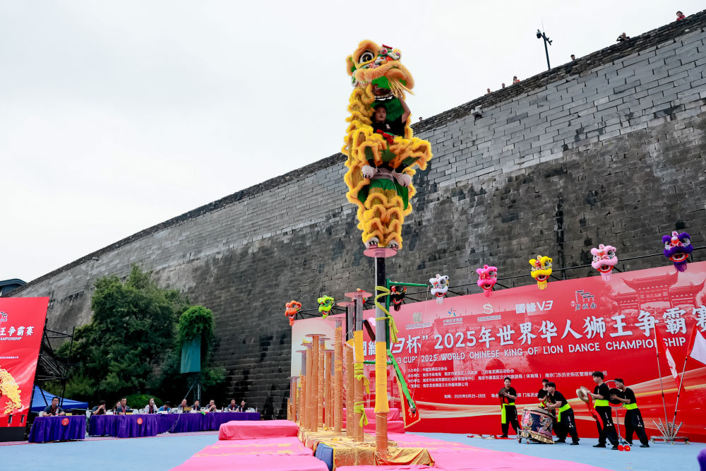 新华社南京9月26日电 高大的明城墙下,一只只“雄狮”在高桩上做出各种帅气的动作,引来阵阵喝彩。“狮跃金陵·舞动世界”2025年世界华人狮王争霸赛26日在南京市秦淮区门东历史文化街区开赛,中国深圳市宝安区西乡蚝业黄连胜醒狮团卫冕南狮高桩自选套路项目“狮王”。