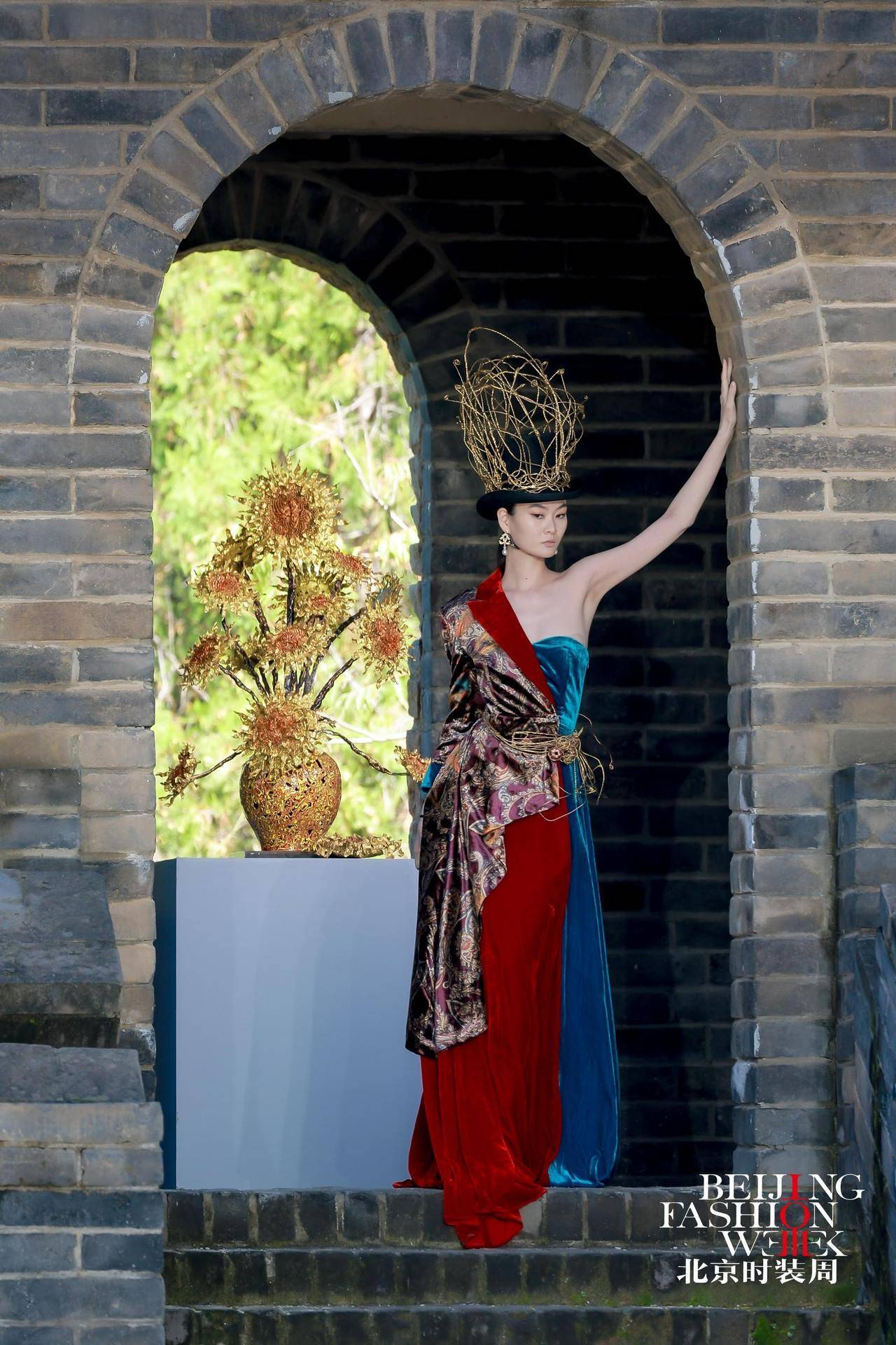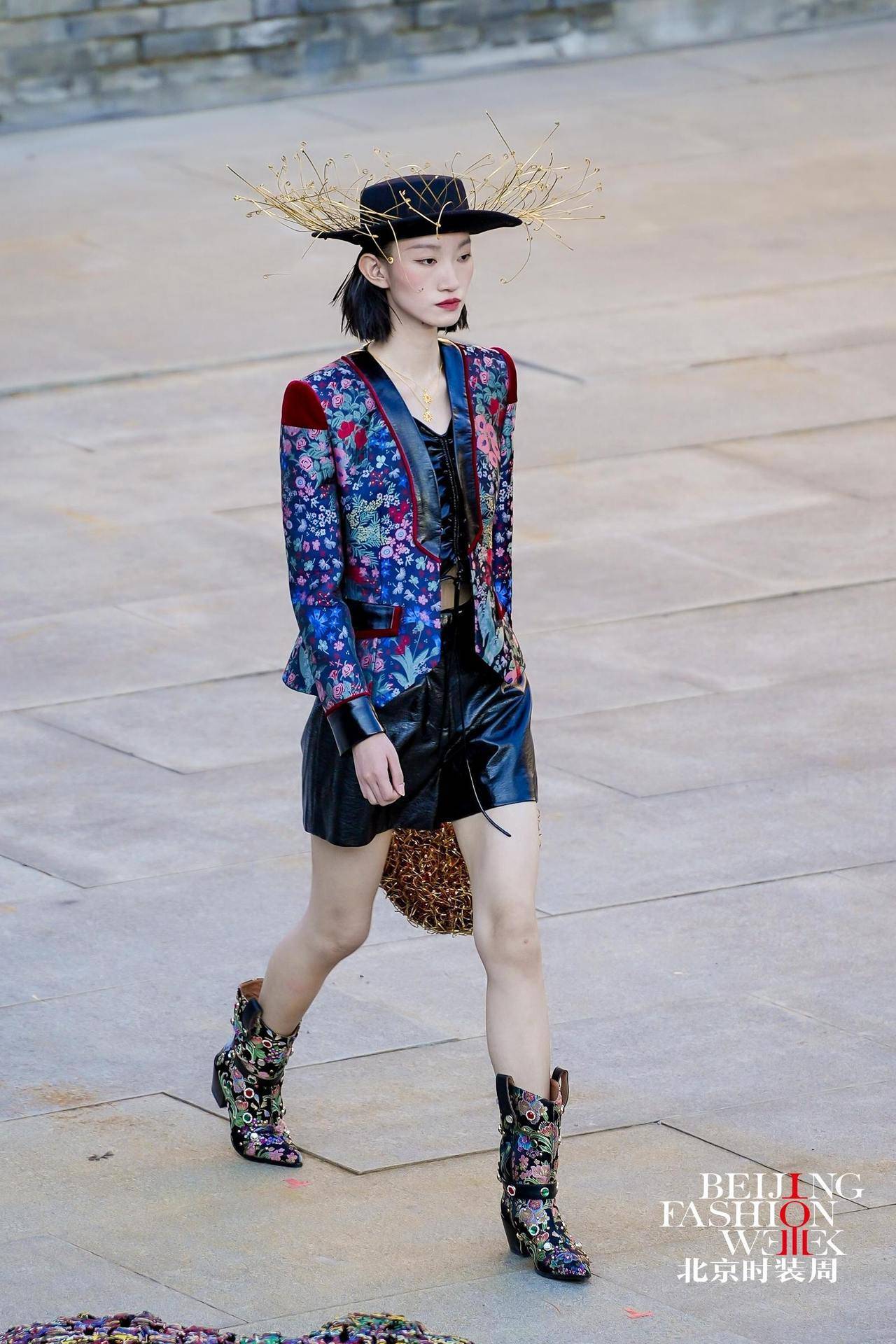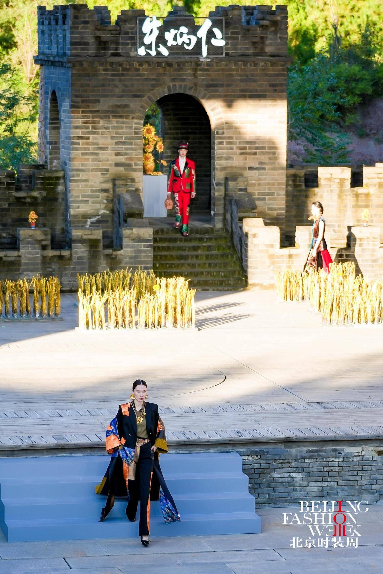 雄伟壮丽的司马台长城脚下,北京时装周的闭幕大秀缓缓拉开,模特们身着以匠人工装为原型重新解构的作品依次登场。工装立体袋、撞色走线与面料拼接的设计,模拟出工装的补丁效果。礼帽、臂环、手袋等配饰则用铜丝金属精心打造,透出刚柔并济的独特质感。古老城墙与现代时装形成“碰撞”,历史与当代仿佛完成了一场无声的对话。