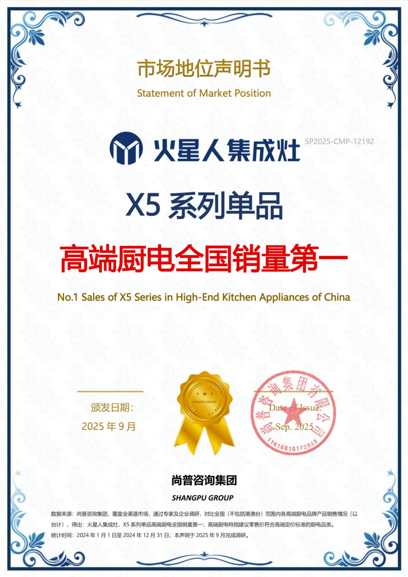 来源:尚普咨询集团,覆盖全渠道市场,通过专家及企业调研,对比全国(不包括港澳台)范围内各高端厨电品牌产品销售情况(以台计),得出:火星人集成灶,X5系列单品高端厨电全国销量第一;高端厨电特指建议零售价符合高端定价标准的厨电品类。统计时间:2024年1月1日至2024年12月31日;本声明于2025年9月完成调研。