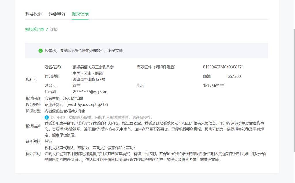 澎湃新闻注意到,在汪剑武出示的“被投诉记录”截图中,投诉者为“镇雄县信访局工会委员会”、有效证件(复印件附后),虽留有联系人姓名与电话,但均被平台隐藏,投诉的理由系“我委发现贵平台用户发布针对我委的不实内容。经全面核查,我委及县纪委系统无‘李卫国’相关人员信息,用户捏造身份属恶意虚构事实。其所述‘欺骗组织、滥用职权’等内容亦无中生有。该内容严重不符事实,已侵犯我委名誉权、损害公信力,依据相关法律及平台规定,望贵平台处理”。但腾讯微信方面提示,经审核,该投诉不符合法定处理条件,不予支持。